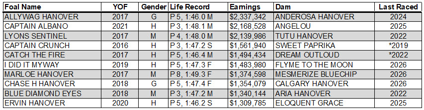 Leading the group were Ervin Hanover p,5,1:46.2s $1,309,785, winner of the G1$600,000 Aged Breeders Crown, the G2 $250,000 Dayton Derby and the G2 $250,000 Ewart; Captain Albano p,3,1:48.1m $2,168,528 winner of the G2 $200,000 Aria Inv , the G3 $100,000 Kane Pace and the G3 $100,000 Always B Miki Invitation at Pocono; Ken Hanover p,5,1:47.3s $1,198,854 winner of the G2 $200,000 Battle Of Lake Erie, G3 $145,500 Allerage, G3 $130,400 Sam McKee Memorial and Dave Brower; 2nd in the G1 $350,000 Fan Duel Final; Chase H Hanover p,5,1:47.4f $1,351,679 winner of 2 legs Borgata Pacing Series and 2nd in the G1 $516,000 Final; and Captain Luke p,4,1:47.3m $943,234 winner of the G3 $131,850 Sam McKee Memorial.