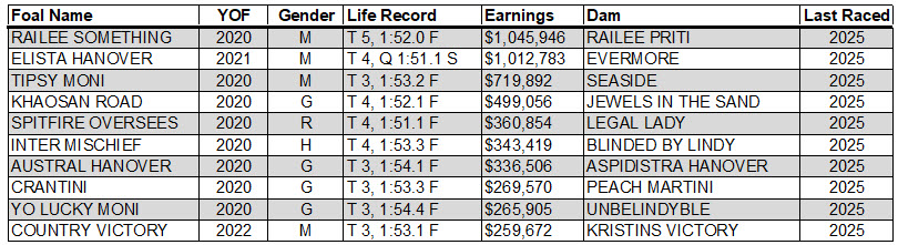 $252,000 PASS 3YOFT Champion Elista Hanover t,3,1:51.3m $479,832 (18 starts-12-1-3 $462,244 in ’24)